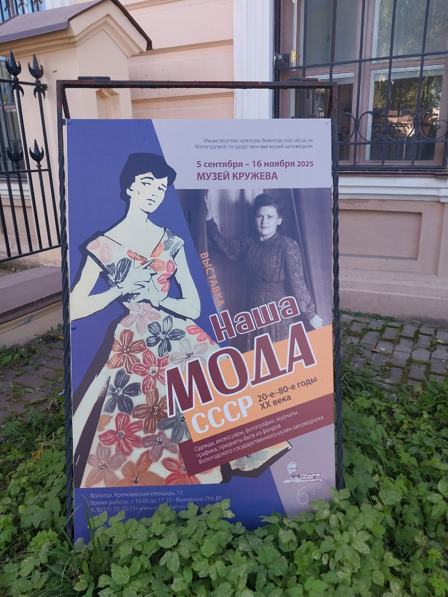 Забавно, что недавно моё внимание привлек комментарий с сарказмом о том, что показываю винтажные вещи. Сегодня посетила выставку в Музее кружева под названием "Наша мода. СССР, 20-80 гг XX века". Выставка временная, размещена в двух залах музея, проходит с 5 сентября по 16 ноября 2025 года в Вологде. Я спросила у смотрительницы: "Откуда все эти вещи?", она ответила, что из фондов Вологодского музея-заповедника (сейчас идёт масштабная реконструкция, поэтому выставили в здании Музея Кружева), что-то принесли сотрудники музея. На вывеске указано, что здесь размещены одежда, аксессуары, журналы, фото, предметы быта. На самом деле там много обуви, есть сумки. Одежда представлена женская, мужская, детская. Детской совсем немного. Из мужского ещё интересные галстуки. Итак, поехали. Фото я сделала довольно много. Там всего 2 зала, но экспонатов достаточно много, не пусто. У входа встречает информационный плакат с исторической справкой. Я сделала фото, чтоб почитать дома позже, тк на глянцев