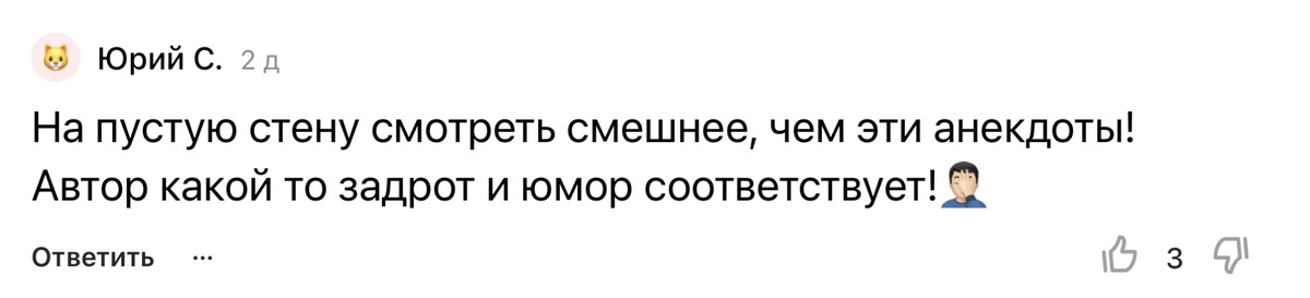 А перед началом показываю лучший комментарий ⬇️ Но пока что они очень печальные, и я буду исправляться и делать статьи лучше! Всегда стараюсь ради вас🥺❤️ Делитесь анекдотами с близкими, друзьями и коллегами, пишите комментарии, может быть, именно твой попадёт сюда 🥰 ❗️ОБЯЗАТЕЛЬНО НУЖНО ПОСТАВИТЬ ЛАЙК, БЫТЬ ПОДПИСАННЫМ И ПОСТАВИТЬ УВЕДОМЛЕНИЕ❗️ Пошлите разогреваться анекдотами⚡️ Хаха, не могу перестать смеяться🤣 Хах, это реально угар, что у нас дальше?) Хаха, вот это поворот😅 Ой, это было огонь, продолжаем!😆 Хаха, просто шикарно, что там дальше?) Хах, я в шоке, давай продолжим!🤣 Хаха, ну это топчик, идём дальше!😅 Ох, ржунимагу, что там ещё?🤣 Хаха, прям зашло, смотрим дальше!😄 ВСЕМ СПАСИБО ЗА ВНИМАНИЕ!❤️ ❗️НЕ ЗАБЫВАЙ❗️ А кто ещё остался, вот специально для вас подборка лучших моих анекдотов за последнее время: 1) https://dzen.ru/a/aL63o2t9klG02ld9 2) https://dzen.ru/a/aL6FVhF5XklzocU6 3) https://dzen.ru/a/aL1guJBI2zHHip9e 4) https://dzen.ru/a/aMAu1bVn3GL5yDof 4) ht