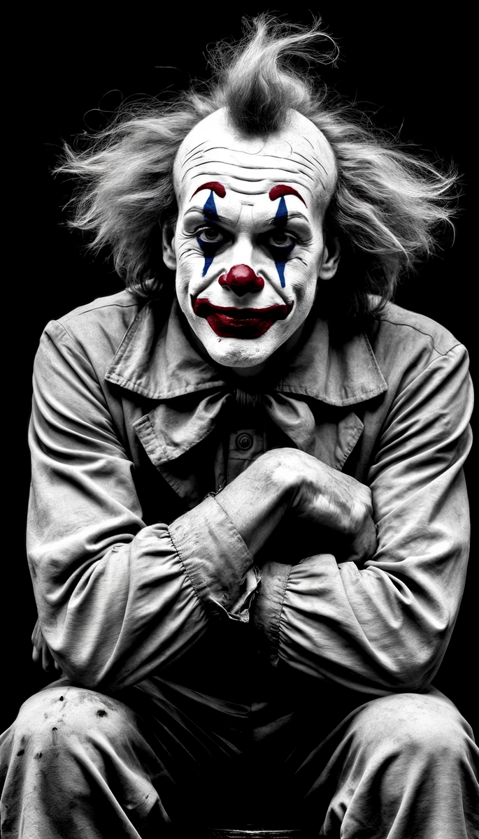 Привет, друзья! Клоун с усталым лицом, в глазах которого тоска и усталость от прожитой жизни, макияж на лице состарился, парик растрепан, плечи опущены и слегка перекошены, он сидит на одиноком табурете, опираясь локтями на колени, атмосфера тоски и безнадежности, низкий угол наклона P.S. Приглашение на Мастер-Классы по изучению Топовых Нейросетей, где Вас ждут Бонусы и Подарки: <<<Участвовать Бесплатно>>>