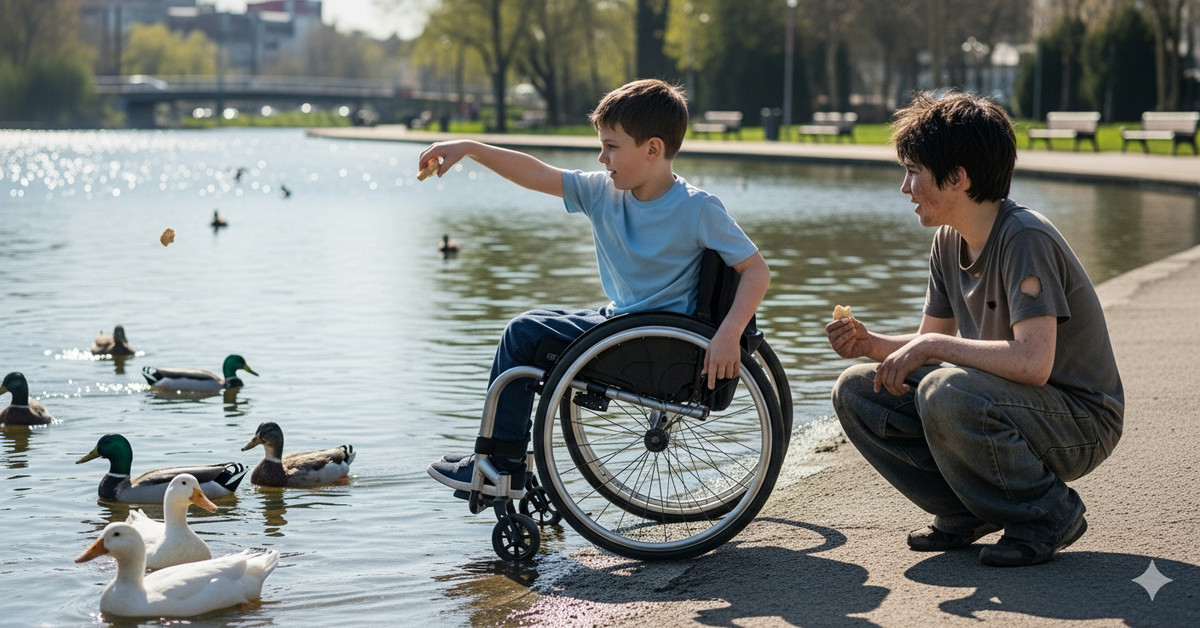 Он привёз его на инвалидном кресле к пруду, дал в руки кусок батона. Илья механически, без всякого интереса, начал крошить хлеб уткам. В этот момент у Дмитрия зазвонил телефон. Это был очередной врач. Дмитрий отошёл в сторону, чтобы поговорить.