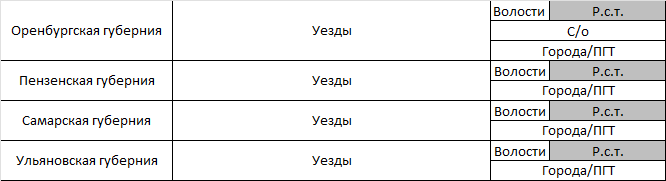 У всех губерний практически идентичный на тот момент тип территориального деления. Небольшое исключение было в Оренбургской губернии, где помимо волостей уже начали появляться сельсоветы.