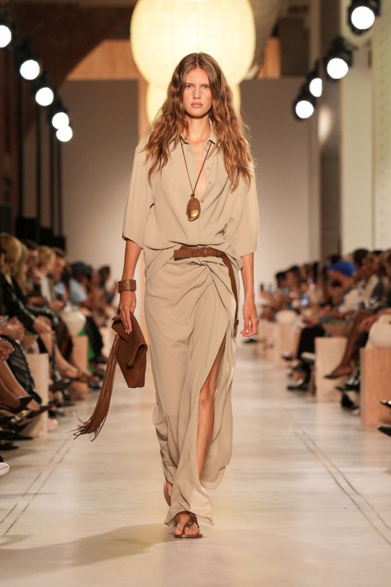 Сегодня мы снова переносимся в Нью-Йорк — на Неделю моды, где Майкл Корс представил коллекцию весна–лето 2026. Бренд, за которым мы следим уже не первый сезон, продолжает удивлять своей способностью находить вдохновение в деталях повседневности и превращать их в моду. Коллекция словно продолжает путешествие: от сияния заката до утреннего света. Фактуры — от мерцающего шифона и сетки с пайетками до плотного льна и шерсти — создают ощущение глубины и многослойности. Цветовая палитра основана на естественных оттенках: шоколад, олива, терракота, песочный и белый. Они работают как нейтральный фон, позволяя блистать силуэтам. Силуэты просты и в то же время драматичны: струящиеся платья с разрезами, костюмы oversize с акцентом на плечи, асимметрия и игра с длиной. Отдельного внимания заслуживают аксессуары: массивные деревянные бусы и подвески, ремни, кошельки на шее, сумки с бахромой. Всё это не просто детали — это высказывание о свободе и смелости. Коллекция объединяет элегантность и естест