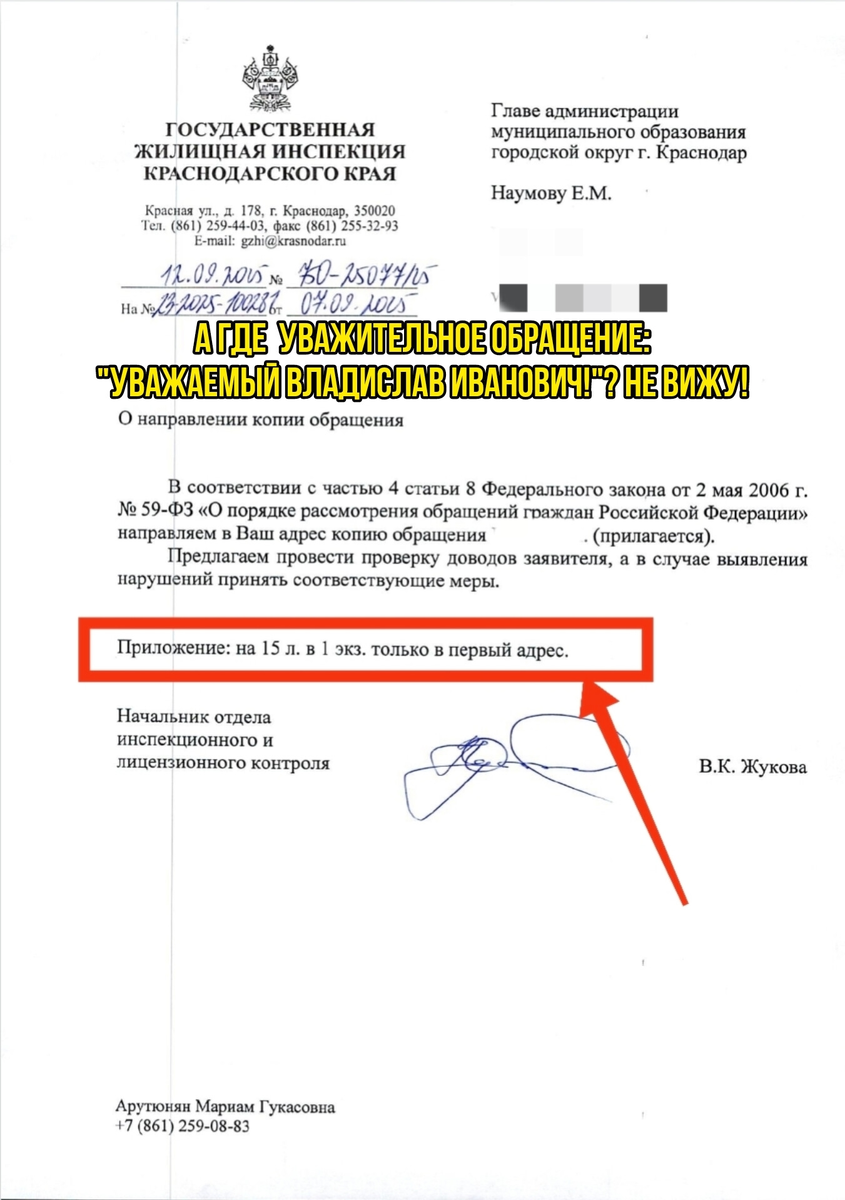 Указанный ответ свидетельствует о грубом и системном нарушении В.К. Жуковой не только Федерального закона № 59-ФЗ, но и собственных должностных полномочий, целей и задач Отдела инспекционного и лицензионного контроля ГЖИ Краснодарского края.