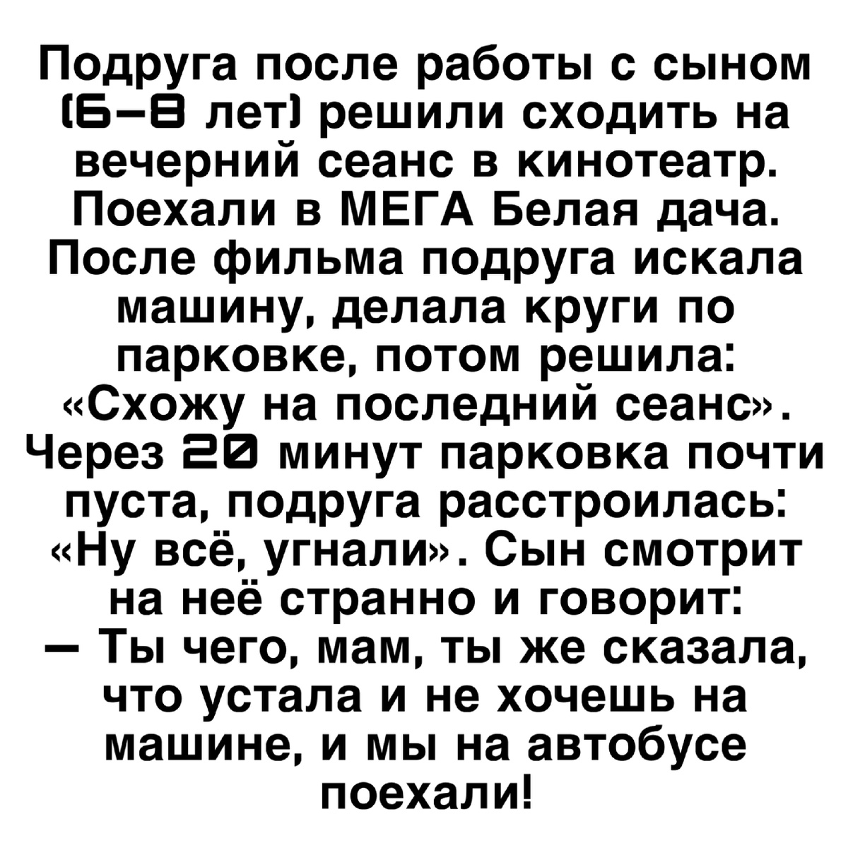 Подруга после работы с сыном (6–8 лет) решили сходить на вечерний сеанс в кинотеатр. Поехали в МЕГА Белая дача. После фильма подруга искала машину, делала круги по парковке, потом решила: «Схожу на последний сеанс».