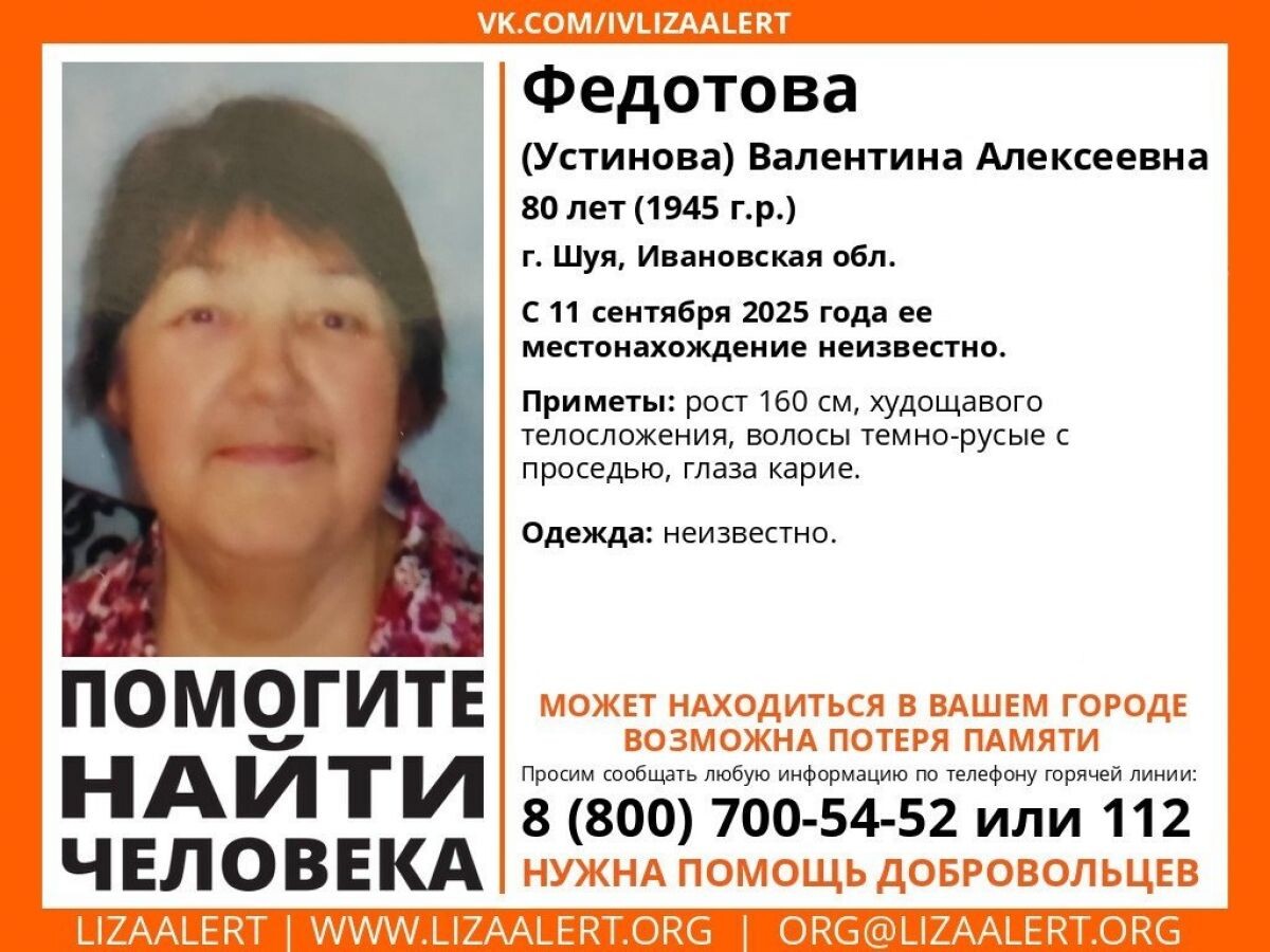 Волонтеры поисково-спасательного отряда Лиза Алерт объявили о начале поисков 80-летней пенсионерки из Шуи Валентины Федотовой. Местонахождение женщины неизвестно с 11 сентября текущего года. На связь с родственниками она до сих пор не выходила.