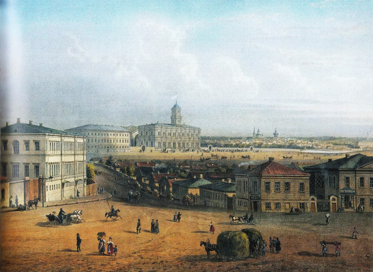 Московский вокзал - уменьшенная копия Петербургского, выстроенный по проекту всё того же архитектора Тона, помещается на тогдашней окраине города - Каланчевской площади, фактически - на пустыре. Зато внутри всё поражает роскошью. Особенно обращают на себя внимание огромные дубовые двери, ведущие в императорские покои. Впрочем, и для господ пассажиров всё отделано нисколько не хуже: дубовые же паркетные полы, мраморные печи, зеркала и камины в диковинке прогресса - ватерклозетах. Если вы не спешите покидать вокзал сразу после прибытия, обратите внимание на то, как устроено отправление пассажиров, следующих в столицу.