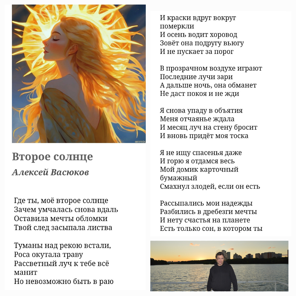 Где ты, моё второе солнце Зачем умчалась снова вдаль Оставила мечты обломки Твой след засыпала листва Туманы над рекою встали, Роса окутала траву Рассветный луч к тебе всё манит Но невозможно быть в раю И краски вдруг вокруг померкли И осень водит хоровод Зовёт она подругу вьюгу И не пускает за порог В прозрачном воздухе играют Последние лучи зари А дальше ночь, она обманет Не даст покоя и не жди Я снова упаду в объятия Меня отчаянье ждала И месяц луч на стену бросит И вновь придёт моя тоска Я не ищу спасенья даже И горю я отдамся весь Мой домик карточный бумажный Смахнул злодей, если он есть Рассыпались мои надежды Разбились в дребезги мечты И нету счастья на планете Есть только сон, в котором ты