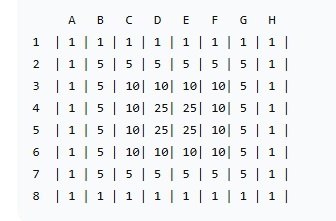 Однако главная уловка заключается в расположении самых ценных монет (номиналом 25). Их всего четыре: D4, E4, D5, E5.