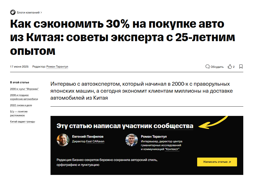 Друзья, к нам обратилось издание Бизнес‑секреты с просьбой рассказать историю автомобильного бизнеса в России глазами одного человека. Сооснователь East CARavan Евгений Панфилов - тот самый, кто прошёл автобизнес с 90-х: от спортивных японских машин и “малярок” для перекраски битых авто до подбора и доставки китайских автомобилей сегодня.