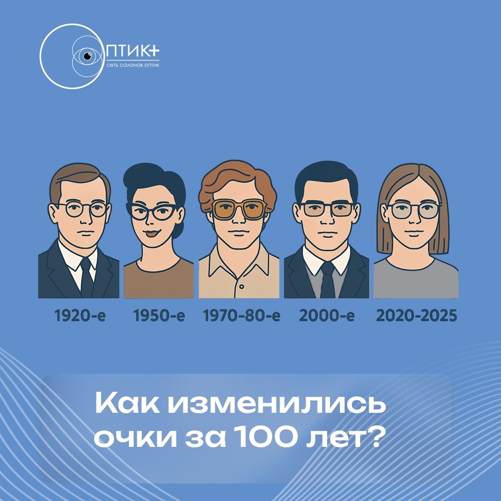 Очки — это не только инструмент для коррекции зрения. Они отражают эпоху, моду и даже характер человека. За последние 100 лет этот аксессуар прошёл путь от строгого медицинского предмета до модного гаджета. В моду входят круглые металлические оправы и монокли. Простота и функциональность становятся главным трендом времени. Пластик открывает новые возможности для дизайнеров. Очки превращаются в символ стиля, а женские оправы в форме «кошачьих глаз» становятся настоящим хитом. Большие оправы, смелые геометрические формы, насыщенные цвета. Очки становятся элементом самовыражения, а не только средством коррекции. На рубеже веков в тренде тонкие металлические оправы и прямые линии. Стиль уходит на второй план, уступая место практичности. Авиаторы, круглые оправы, винтажные формы снова в моде. Очки становятся частью образа и способом подчеркнуть индивидуальность. Современные технологии делают оправы ультралёгкими, а линзы — многофункциональными. Фильтры для работы за экраном, индивидуальная