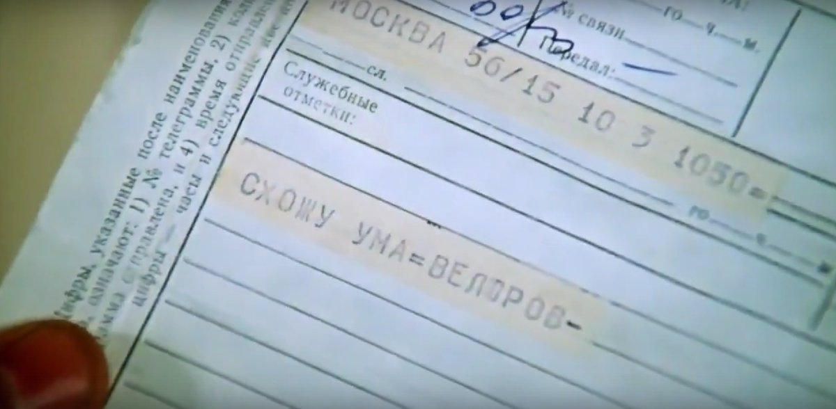 Внимательно смотрю на телеграмму Велюрова Светлане. Михаил Казаков указал дату. 56 (год) 15 (число) 10 (месяца). И нам известна дата знакомства Велюрова и светланы. Три дня знакомы. *Сегодня даже телеграмму прислал.*