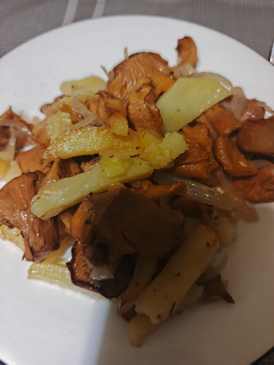 Здравствуйте! Я тут все планирую эту публикацию, и думаю, чего-то не хватает. И действительно, один ужин просто выпал из поля зрения. Я готовила половинки фаршированных перцев, повторяла недавно приготовленное блюдо. И как-то была уверена, что сын такое есть не станет, а он стал, и очень активно. Так что к приходу с работы перцы были растерзаны, мы их доели, и фото я так и не сделала. Растет, вкусы меняются. Но и без этого я готовила много, даже слишком много. Так что показываю наши ужины. С выходных приехали с лисичками, и тут же принялись за их приготовление, не откладывая в долгий ящик. Как обычно, жарю с чесноком, маслом, репчатым луком. Сын отдельно ел картошку с рыбой, без грибов. Продолжая осваивать грибы, готовила гречку по-купечески с белыми грибами и курицей. И целое блюдо домашнего Цезаря с курицей, отварным яйцом, маленькими помидорами и чесночными сухариками. Покупали для салата соус Цезарь от Махеев вроде. Яркий вкус сыра, что мне не по вкусу, а моим мужчинам наоборот.
