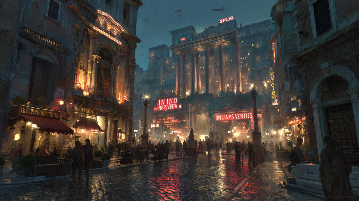 Люди вокруг говорили на гулком, певучем языке, который я с трудом опознала как латынь. Мужчины в строгих туниках поверх брюк, женщины в элегантных столах из переливающихся тканей. И над всем этим возвышались немыслимые небоскрёбы из мрамора и стали, их шпили терялись в низких, подсвеченных неоном облаках. Рим не пал. Он просто продолжал расти — вверх и в будущее.