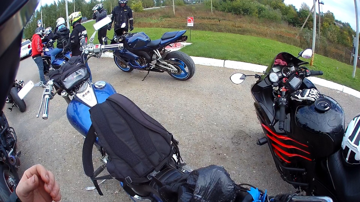 Компания у нас разношёрстная: и спортбайки, и маленькие круизёры, и большие круизёры, и дорожник. Ведущие колонны ориентируются на самых медленных, то есть на меня. Едем 110. Езда колонной отличается от одиночных покатушек: больше следишь за товарищами, меньше по сторонам глазеешь; нельзя так просто остановиться, если приспичило... сфотографировать. Но есть и вдохновляющий момент, когда ощущаешь себя частью чего-то большего, и знаешь, что не один.
