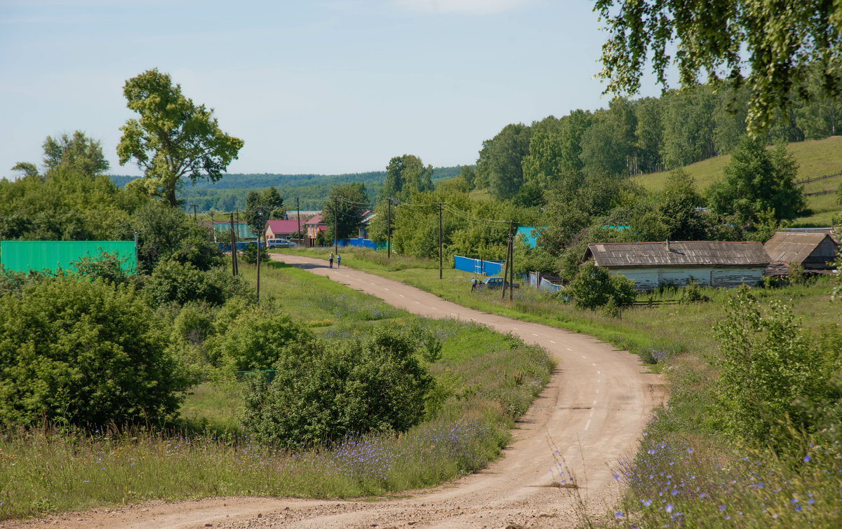 От города Туймазы до Камыштау ехать чуть больше часа. Съезжаем с шоссе на грунтовую дорогу согласно указу навигатора. Скромная табличка, наполовину скрытая ветками деревьев, возвещает о том, что мы на месте. С одной стороны поселение обрамляют холмы, покрытые лесом, с другой, в низине, протекает речушка Каран, на берегах которой растет камыш. Отсюда и название. Слева от нас – кладбище. Видно, что не заброшено: ухоженные могилы, скошенная трава, крепкий забор.