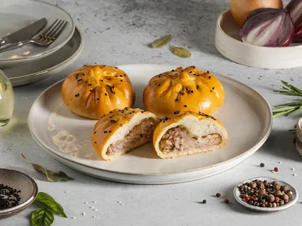 - У испеченных шариков срезать острым ножом верх, наполнить начинкой, закрыть срезанными крышечками из теста и поместить в духовку на 5 минут. 9) Готовые пирожки сверху можно украсить зеленью.