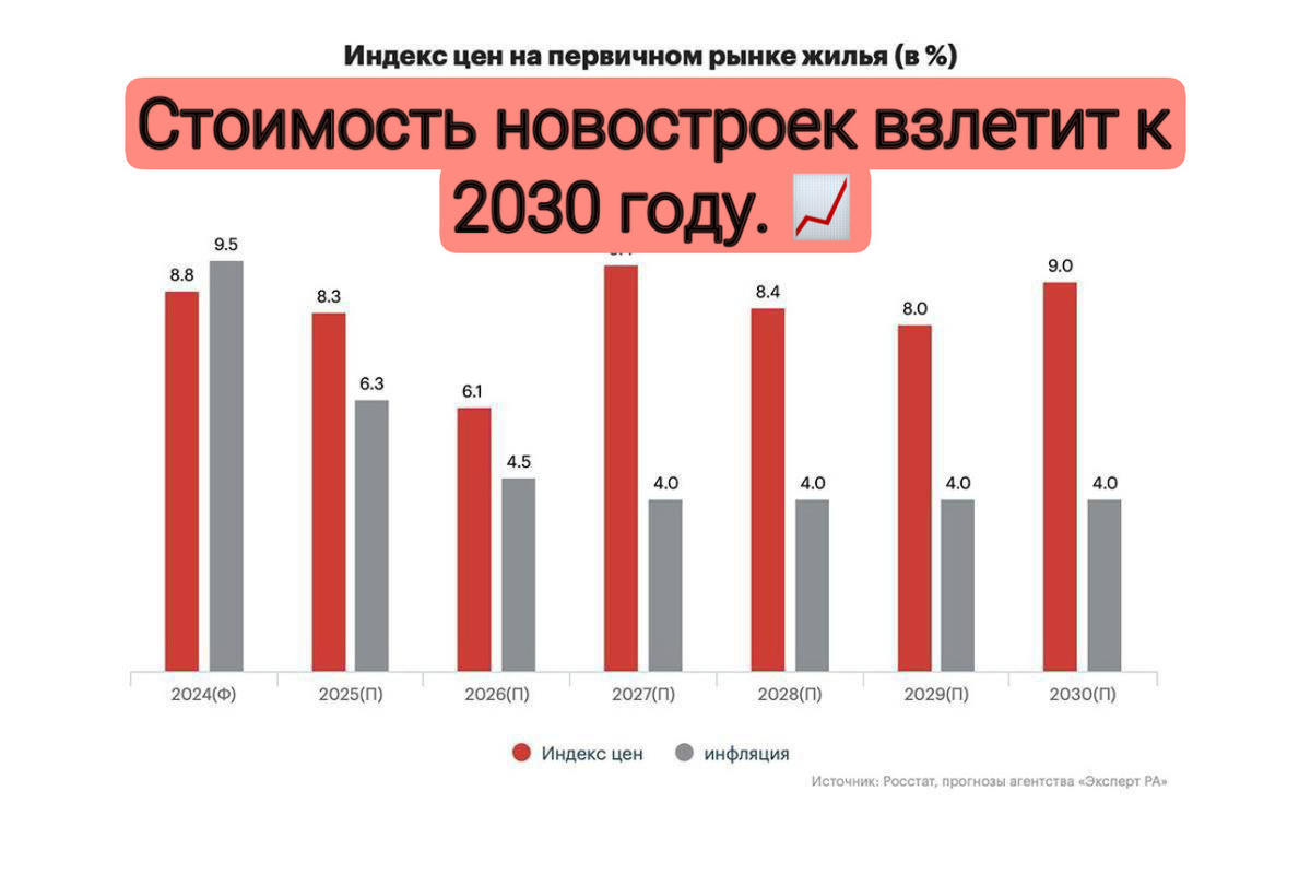 Стоимость новостроек взлетит к 2030 году. 📈 Стоимость квадратного метра в новостройках России к 2030 году покажет значительный рост. Как пишет РБК со ссылкой на опрос аналитиков, ежегодный прицен составит стабильные 6-10%. Главный вывод: индекс стоимости первичного жилья будет стабильно обгонять инфляцию, а с 2027 года этот разрыв и вовсе станет двукратным. Это значит, что деньги на депозите или «под матрасом» будут обесцениваться быстрее, чем дорожать жилье. Что это значит на практике? Квартира, купленная сегодня, — это не только решение жилищного вопроса, но и мощная защита капитала от инфляции и одна из самых надежных долгосрочных инвестиций. Почему лучший момент — именно сейчас? Цены еще не выросли. Каждый месяц ожидания — это упущенная выгода и увеличение бюджета на покупку в будущем. Что это значит? Квартира, купленная сегодня, через 5 лет будет стоить на 30-50% дороже. Деньги на счете — нет. Я помогу вам: · 🧮 Сравнить ипотечные предложения от банков и получить