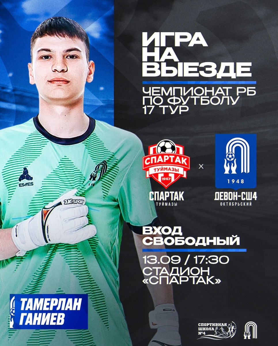 На стадионе «Спартак» в Туймазах пройдёт очередной матч чемпионата Башкирии по футболу среди мужских команд. На поле сразятся команды «Спартак» из Туймазов и «Девон-СШ4» из Октябрьского. Футбольный матч пройдёт 13 сентября. Начало — в 17.30, вход свободный. Автор: Анастасия Аверина
