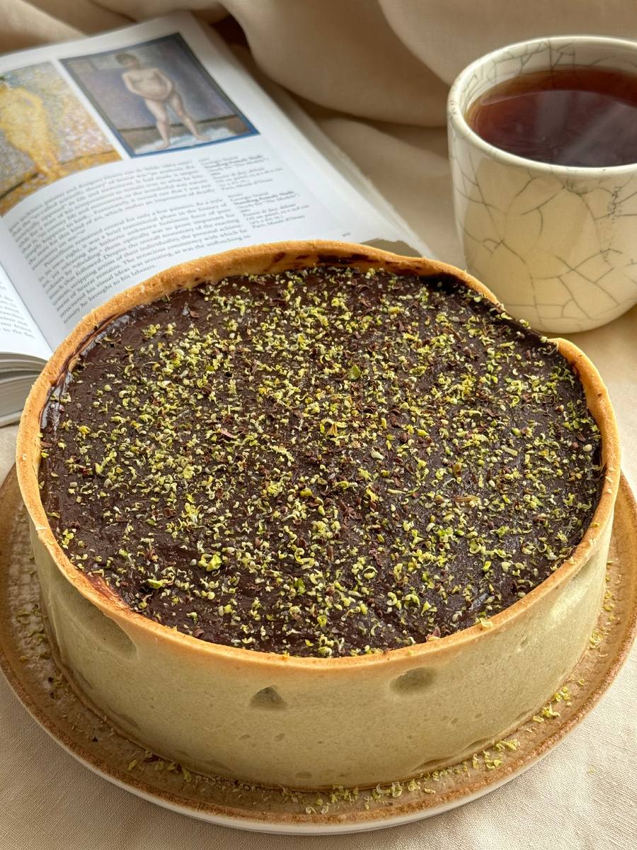 - Снимите с огня. Закиньте пасту и масло, перемешайте, можете пробить блендером. Перелейте на основу, пеките 20-25 минут при 200 С. Остудите немного в комнатной температуре и 6 часов в холодильнике.