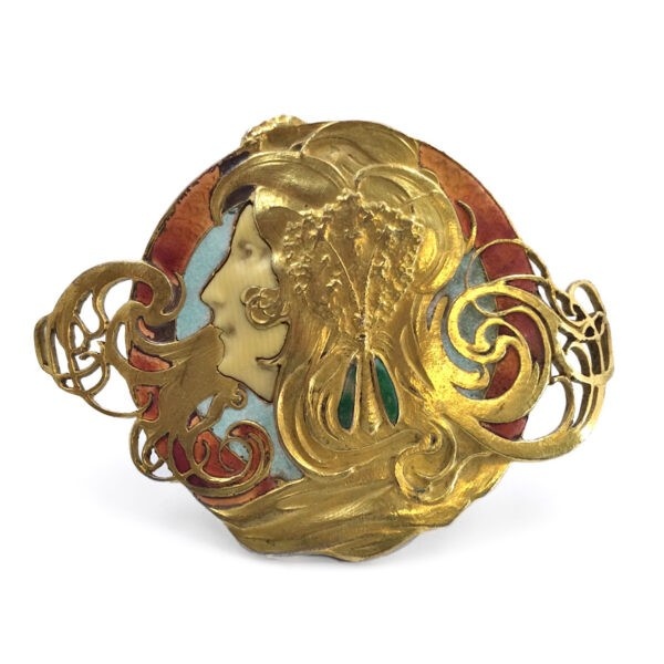 На рубеже XIX и ХХ веков женщины стали не только вдохновительницами и покупательницами художественных украшений, но и популярной частью их дизайна, знаковым художественным мотивом. Пожалуй, ни до ни после в ювелирной моде женский образ не использовался столь часто и разнообразно, как в этот период. Такие образы как девушка-фея, крылатая нимфа, женщина-бабочка или женщина-цветок – стали культовыми символами эпохи. Многие эти образы связаны с творчеством Альфонса Мухи, который, помимо прочего, создавал дизайны ювелирных украшений и тесно сотрудничал с ювелиром Жоржем Фуке. Пряжка из позолоченного серебра по дизайну Альфонса Мухи, «Piel Freres», Париж, 1900 г. Диадема «Византийская принцесса» в стиле Альфонса Мухи, золото, опал, бриллианты, около 1900 г. В период с 1896 по 1898 годы Муха создал серию под названием «Византийские головы» с изображением женщин в фантастических головных уборах, как и в этой диадеме – с двумя круглыми дисками, закрывающими ухо, и длинными свисающими золотыми п