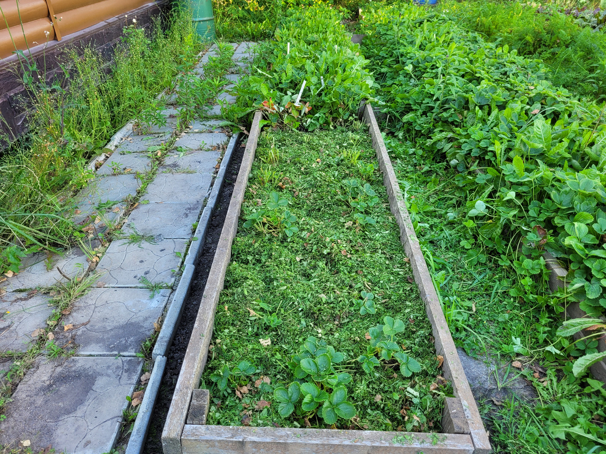 На свои трёхуровневые грядки посадила клубничные усы и застелила землю скошенной травой.
