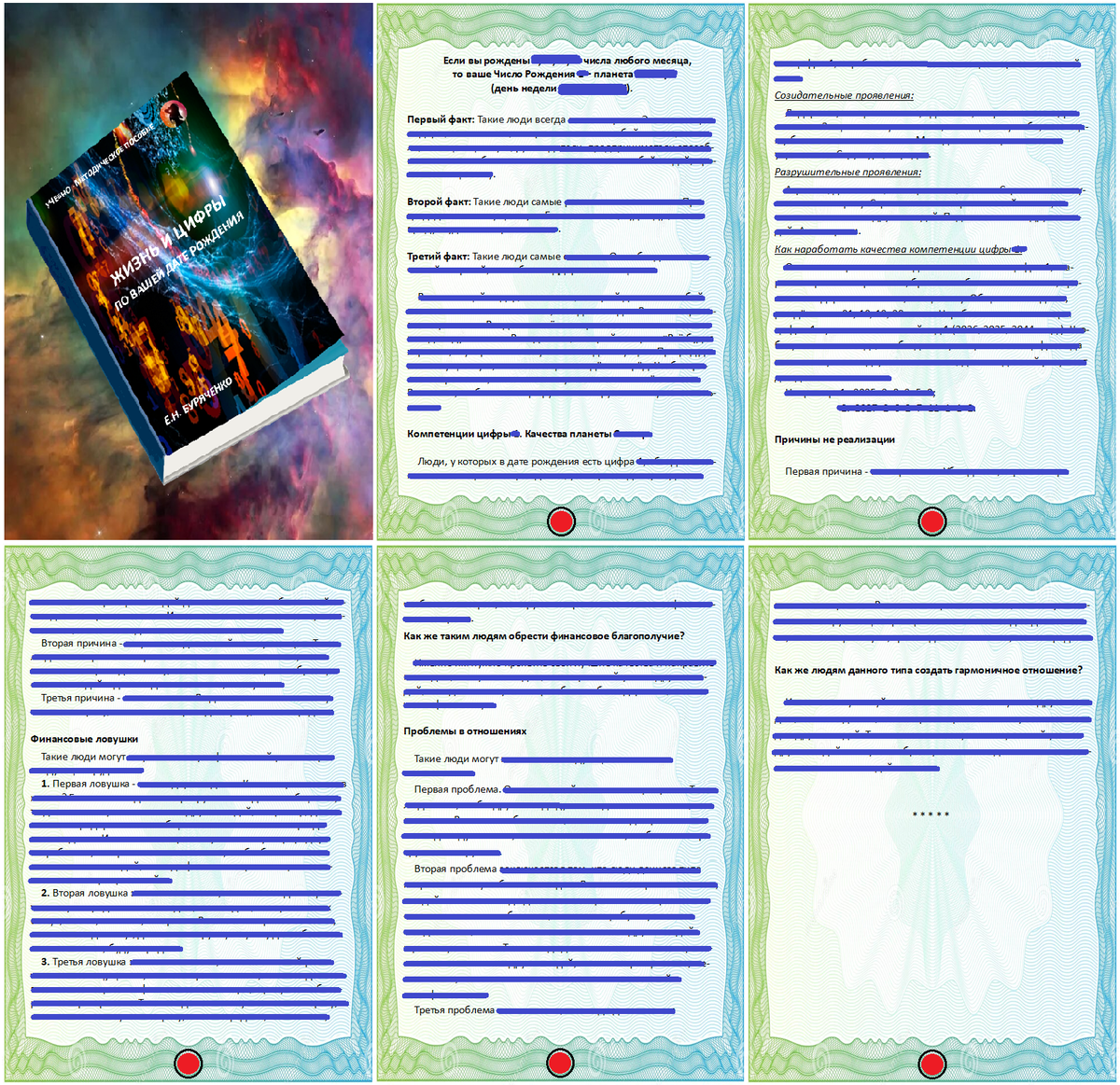 По желанию клиента может прилагаться авторская эл.книга (pdf файл) "ЖИЗНЬ И ЦИФРЫ ПО ВАШЕЙ ДАТЕ РОЖДЕНИЯ".