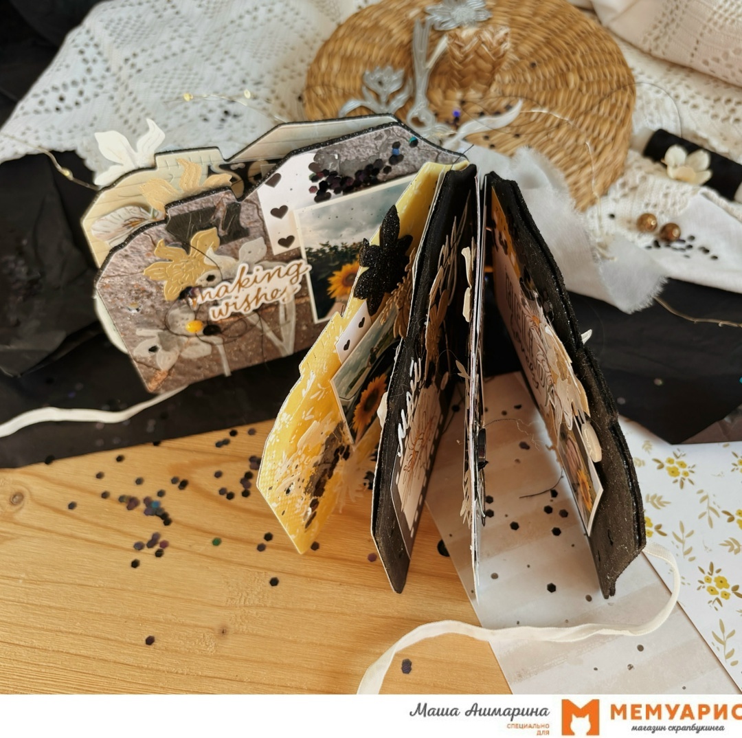 Привет, дорогие! Здесь Маша и, наконец, мой скрап! Лето выдалось насыщенным. Таким, что не то, что дойти до своего уголка невозможно, но в его сторону даже посмотреть! А теперь осень.. самое прекрасное время раскладывать летние воспоминания по коробочкам памяти и альбомчикам. А поехали в подсолнуховое поле, туда, где желтый переходит в южное тучное серое небо, а земля - прилипучий чернозем! Эта история про прогулку среди цветов солнца рассказана для нашего задания «Осенний натюрморт». Не слишком ли мрачная палитра? Ни в коем случае. Как та самая черная-черная земля наряжена яркими цветами, и где-то - нами :) Форма альбома создана узнаваемыми миминожами, ими же и посажены цветы на страничках альбома. Фонами идет бумага «Айда обниму» от Скраподелие. Как нельзя лучше подходят эти милые цветочки, монохромные фоны. А еще здесь - милые персонажи, подмигивающие из-за фото. И мудрые фразы того гусенка. Текстурные фоны с трещинками - это «Город живет» от GoldenScrap. Спинка альбомчика тоже про