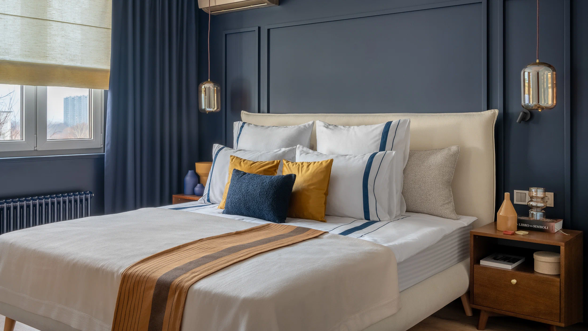 Как и остальные помещения в этой квартире, спальня довольно просторная — 15 квадратных метров. Такую площадь уже можно назвать полноценной, а главное — она позволяет не бояться тёмных оттенков. Этим я и воспользовалась, тем более что заказчики изначально мечтали о насыщенном синем цвете в интерьере. В гостиной и кухне этот оттенок «не прижился», зато в спальне оказался как нельзя кстати — глубокий, благородный, он буквально настраивает на спокойный, восстанавливающий сон.