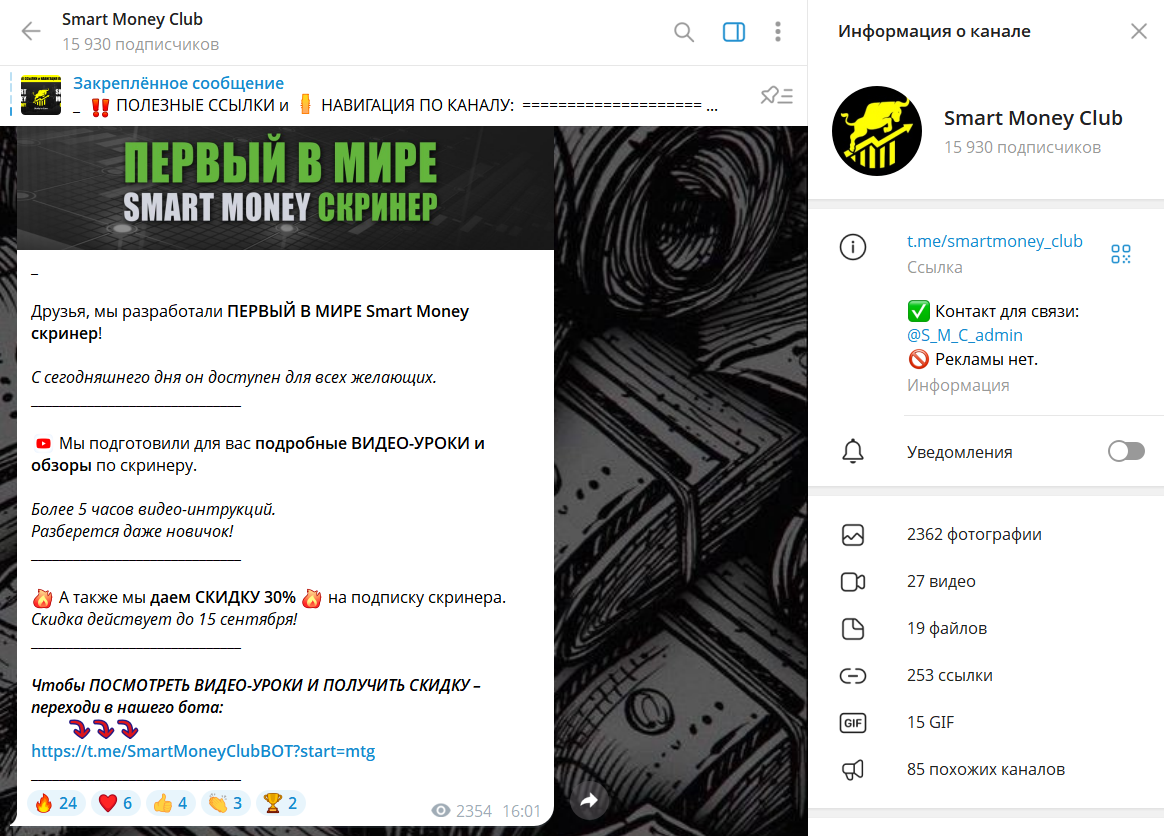 Канал подаёт себя как создателя «первого в мире Smart Money скринера». Уже сама формулировка вызывает вопросы: инструменты для анализа и поиска сделок существуют десятилетиями, и назвать продукт уникальным можно только в рекламных целях.