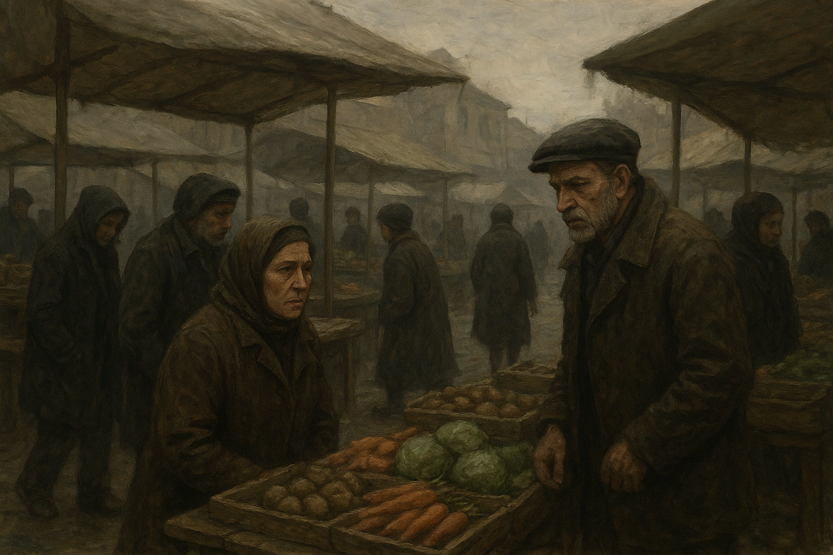 Смех, пьяные споры и азартный торг ушли — рынок напоминал угасающий костёр 🔥, в котором едва теплился жар. И всё же люди пытались играть в «нормальную жизнь»: