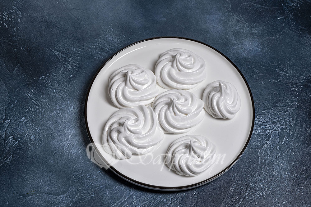 При помощи миксера взбиваем яичную смесь до глянцевой красивой меренги. Не останавливаем процесс до тех пор, пока масса не станет белоснежной, гладкой, крепкой.
