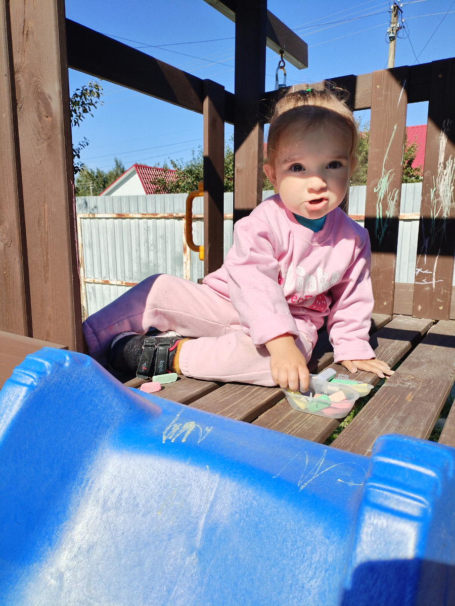 Амелька на горку забралась, рисовала. Пыталась я с ней опять выяснять, где и какого цвета мелок, не получается. Вот почему, в светофоре видит красный и зелёный, различает, говорит, а в мелках нет? Или все-таки различает, а забывает название цветов? Не пойму никак. Или просто не созрела для этого.