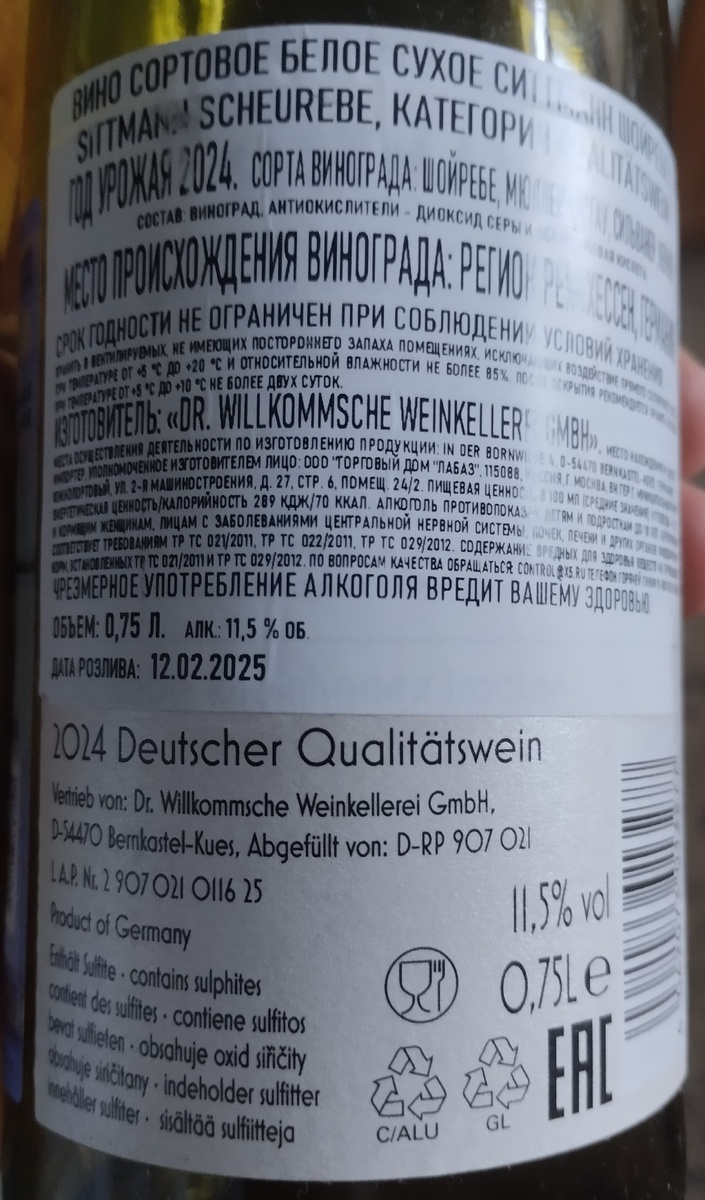 Несколько лет назад около дачи началось строительство. Закрытый забор, грузовики, которые катаются туда-сюда. И открылась Пятерочка с неплохим винным отделом, если принять во внимание, что в нашем населенном пункте живет шесть тысяч человек. И все аккуратно выставлено. Прям, музей Карла Фаберже. И там есть 'эта собака. Этакий псинка. И состав его странный, но тем и интересен: Мюллер Торгау, Сильванер, уже бывший в этом блоге Кернер и Шойребе. Сейчас это тренд на полке и в ассортименте виноторговых компаний: импортировать Германию. Данное вино-это собственный импорт этой сети и по акции оно стоило меньше 1000 рублей. И мы начинаем! Цвет светло-желтый, почти соломенный. В аромате дыня, сладкая груша, сладкое яблоко, желтое яблоко, ананас, гречишный мед, тропики, консервированные персики, леденцы, мокрые камни. Во вкусе средняя кислотность, среднее тело, средняя длина послевкусия, в котором читается компот из груш и яблок. Во вкусе мед и лимонная цедра. Баллов 86. Кислотности бы ему поб