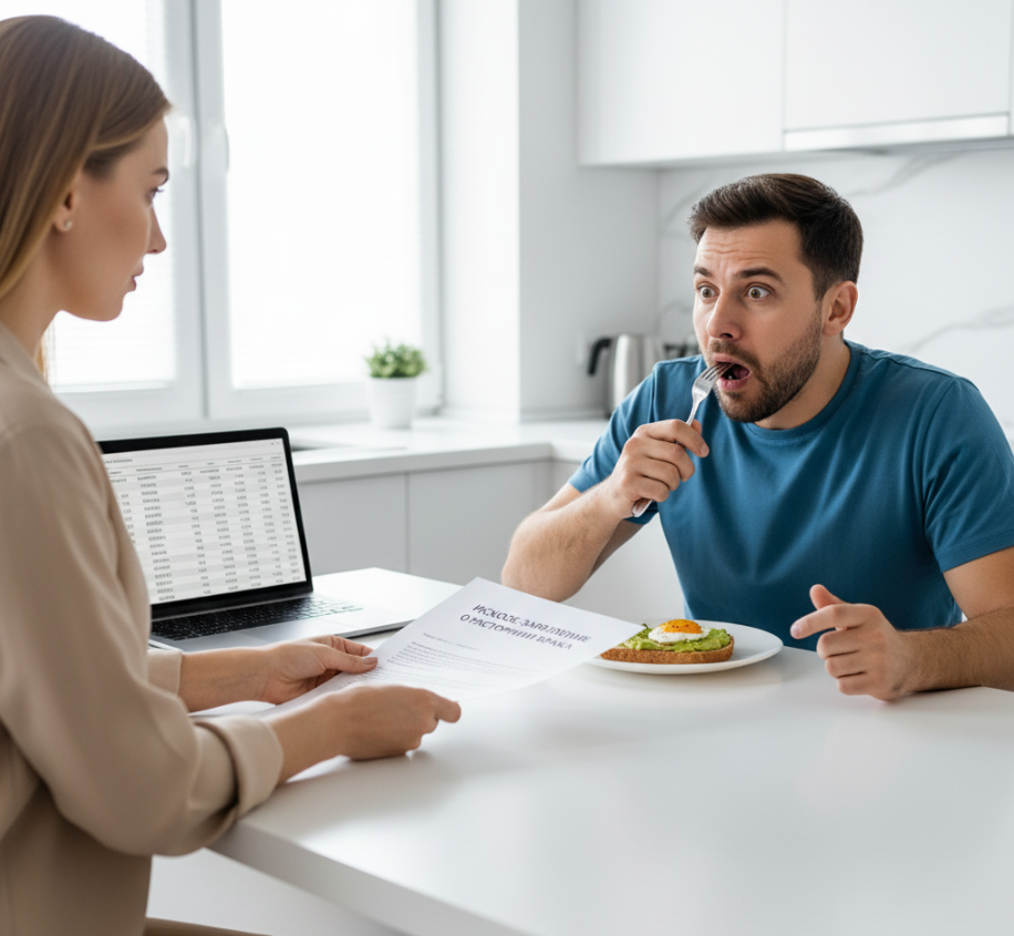 Его лицо изменилось. Он медленно опустил вилку. Легкая улыбка сползла, обнажив растерянность и страх.