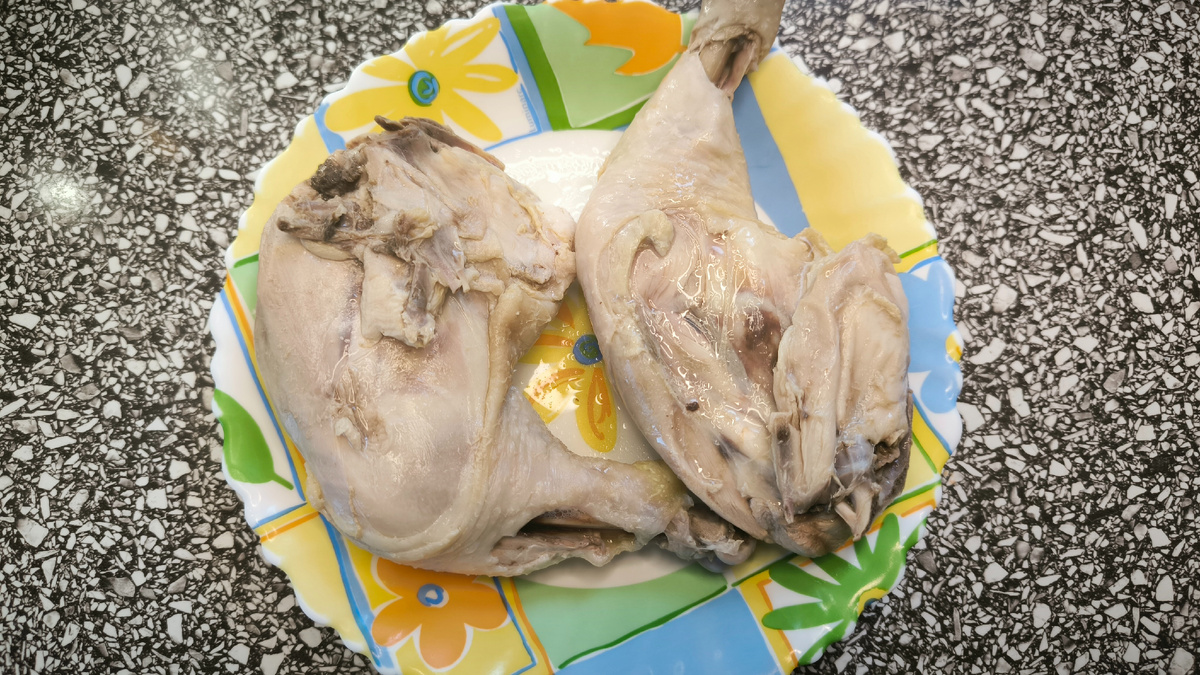 Я отварила куриный окорочок в подсоленной воде. Когда он остыл, аккуратно отделила мясо от кости.