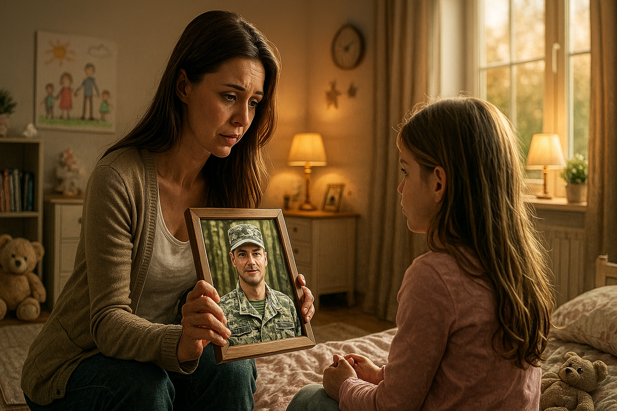 Вечером, когда Катя укладывала её спать, ребёнок неожиданно протянул ей старую потрёпанную фоторамку. На фотографии был мужчина в военной форме, стоявший на фоне леса.