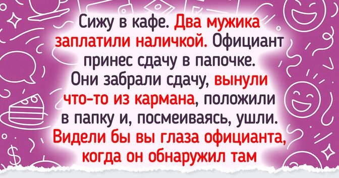 Мужчина с женой пошли в ресторан. Карта не прошла — официантка тут же швырнула её на стол: «Собрались сбежать?!» После вызова менеджера и успешной оплаты второй картой, она вдруг спросила: «А чаевые?» Ответ был холоден: «Грубость — не повод для щедрости». Мораль: даже подозревая мошенничество, можно быть вежливым.