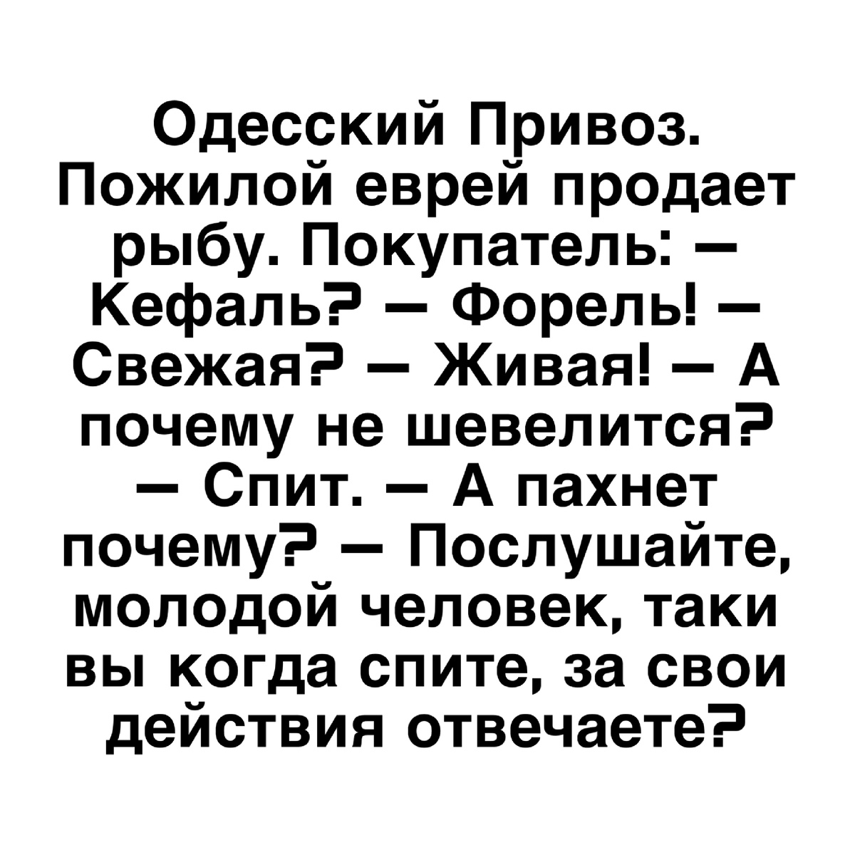 Одесский Привоз. Пожилой еврей продает рыбу. Покупатель: — Кефаль? — Форель! — Свежая? — Живая! — А почему не шевелится? — Спит. — А пахнет почему? — Послушайте, молодой человек, таки вы когда спите, за свои действия отвечаете?