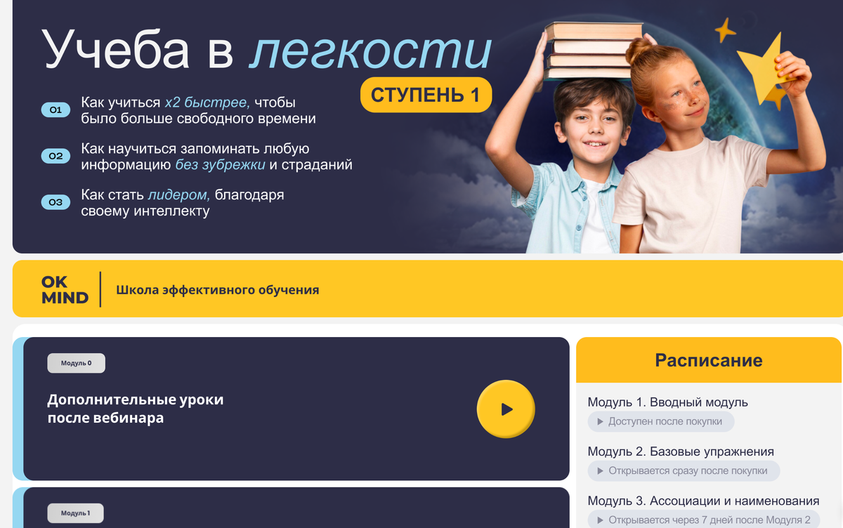 Я записала большой курс по развитию памяти для детей. В нём много информации о том, как запоминать разные виды данных. Есть практика, теория, в основном примеры из школьной программы. Но уже первый поток показал, что информации для детей оказалось слишком много, поэтому я разделила курс на две ступени. Сейчас есть информация и на сайте, и на вебинаре — только про первую ступень. Если ребёнок освоил её, он может прийти на вторую.