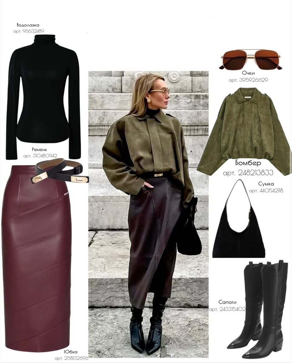 Один образ — много сценариев. Водолазка 96632489, ремень 310480942, юбка 258132696, очки 395926629, бомбер 248213833, сумка 440542118 и сапоги 243315402 составляют капсулу на сезон: меняйте только верх/обувь — и каждый раз будет «новая» картинка.