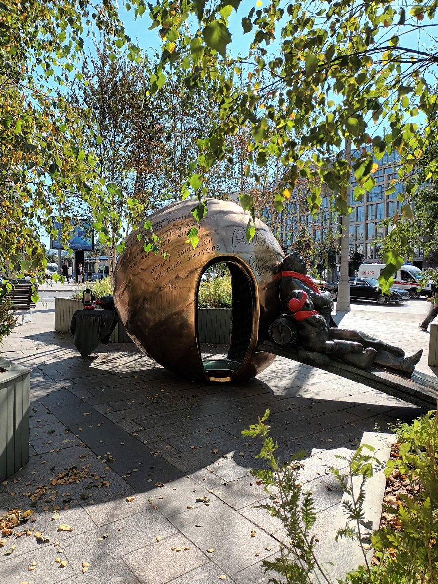 Матроскин и раки. Вселенная Олега Табакова в одной скульптурной композиции. Малая Сухаревская, 3. Посреди шумного Садоваго кольца столицы, где со свистом проносятся тысячи машин, ты случайно оказывашься в озисе русской действительности. В сентябре, как будто даже рощей осенней пахнет. И для наших дней необычная жанровая скульптурная композиция - "Атом Солнца "Олега Табакова". В этом памятнике автор Александр Рукавишников отметил все, что только возможно. Расслабленая скульптура мастера, в друзьях кот Матроскин, куда же без него, молекула атома, солнце, а еще простой деревенский завтрак. Вкуснющие раки, сочные южные томаты, холодный квас и краюха хлеба. А еще фонарь из прошлого. Так и видишь, как в ночи мотыльки кружатся. Почему такой странный памятник? Автор и близкие люди хотели напомнить зрителю все, что так любил в жизни Олег Павлович. Почему все-таки атом? С легкой руки Виктора Розонова. Драматург был впечатлен ярким и необузданным талантом молодого артиста . Он воскрикнкл: "Таба