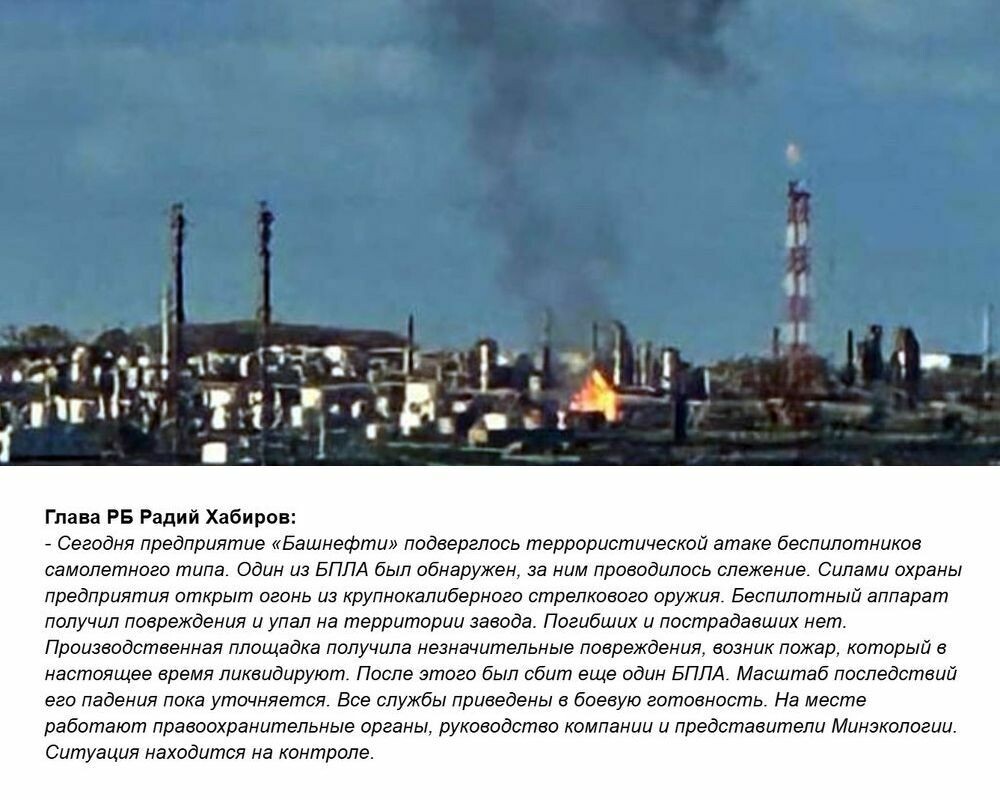 13 сентября Глава Республики Башкортостан в соцсетях сообщил об атаке беспилотных летательных аппаратов на предприятие «Башнефти», расположенное в Уфе. По словам руководителя региона, в результате атаки вражеских беспилотников погибших и пострадавших нет, при этом производственная площадка получила незначительные повреждения и возник пожар, который в настоящее время ликвидируют. ИА «Башинформ» сообщает, что предприятие, атакованное украинскими БПЛА, работает в штатном режиме, так как повреждения при атаке были незначительными и выпуск топлива продолжается, никаких перебоев с поставками топлива не ожидается.
