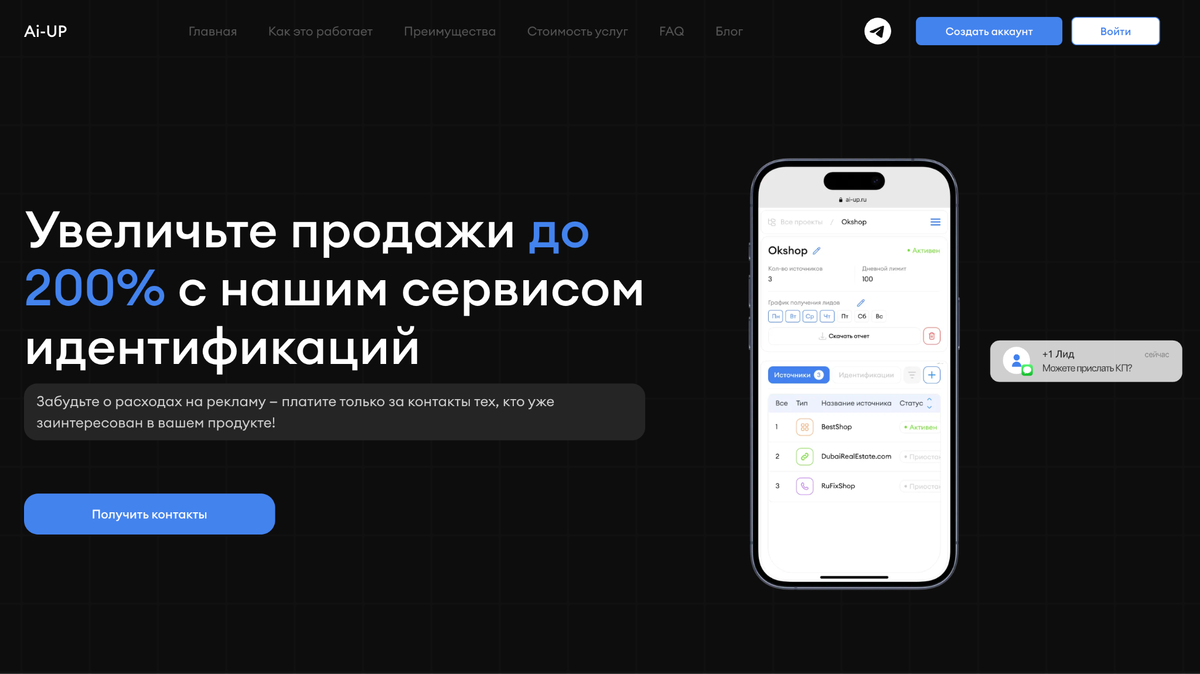AI-UP — инновационная платформа, использующая технологии искусственного интеллекта для работы с «потерянными» и конкурентными лидами. Сервис поддерживает четыре способа получения контактов и оснащён собственной CRM-системой, что упрощает полный цикл обработки заявок.