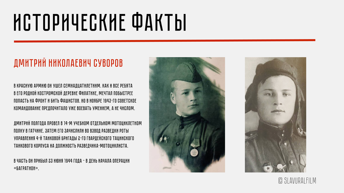 Дмитрий Николаевич Суворов — герой одной из серий проекта «Европа — Азия» компании «СлавУралФильм». Дмитрий Суворов в 1943 году ушёл добровольцем в армию в 17 лет. Он принял участие в двух знаменитых операциях: «Багратион» по освобождению Белоруссии и в разгроме немцев в Восточной Пруссии и Кёнигсберге. В 1945 году белорусский художник Валентин Волков приступил к созданию монументального произведения, посвящённого этому событию. Одним из героев картины «Минск. 3 июля 1944 год» стал наш земляк — ветеран, полковник бронетанковых войск Дмитрий Николаевич Суворов, которому в мае 2025 года исполнилось 99 лет! Из ветеранов Великой Отечественной войны, которые были прототипами участников-освободителей монументального полотна, в живых остался только Дмитрий Николаевич Суворов. Подробности в СМИ ______________ Компания SLAVURALFILM / «СлавУралФильм» приступила к производству масштабного проекта «Европа — Азия» об исторических событиях, произошедших на границе между Европой и Азией. Обновлённая