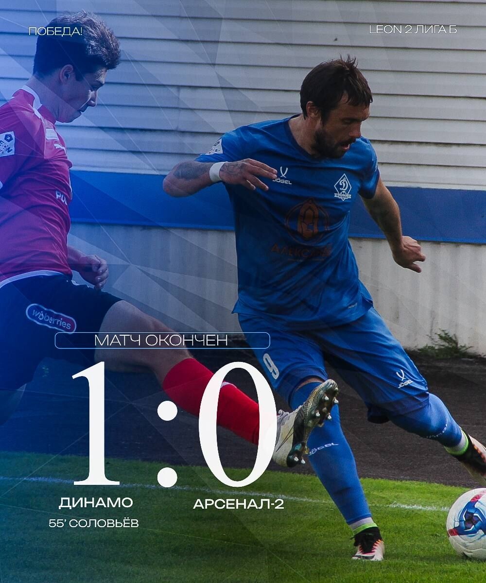 Завершился матч в рамках Второй Лиги Дивизиона Б между ФК «Динамо-Брянск» и ФК «Арсенал-2». Встреча, проходившая на центральном стадионе в Брянске,завершилась победой хозяев со счётом 1:0. В первом тайме динамовцы обладали явным преимуществом, но реализовать свои моменты так и не смогли. В начале второго тайма Иван Соловьёв точным ударом выводит хозяев вперёд. В оставшееся время брянские футболисты, обладая преимуществом, реализовать свои моменты не смогли, победив туляков с минимальным счётом. По итогам состоявшейся игры ФК «Динамо-Брянск» поднимается на 2-ую строчку в турнирной таблице. ФК «Арсенал-2» остаётся на 11-ом месте в общем зачете. Следующую игру ФК «Динамо-Брянск» проведет 20 сентября в 16:00 по московскому времени. Футбольный клуб из Брянска примет «Строгино». 6+
