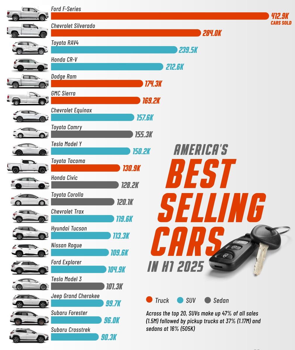 Самые продаваемые автомобили в США в 1 полугодии 2025 г.