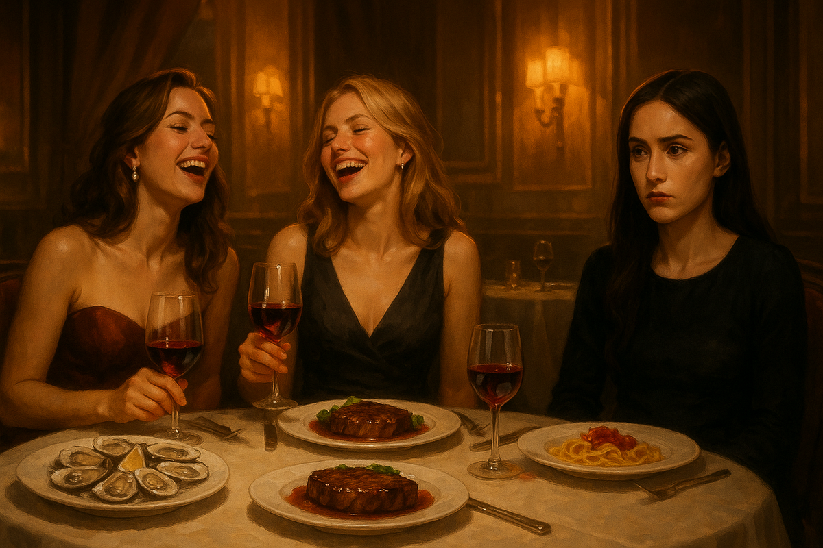 А они — понеслось. Устрицы, стейк, два вида салата, десерт, бутылка дорогого вина. Потом ещё коктейли. Смеялись, щёлкали фотки, выкладывали в сторис.