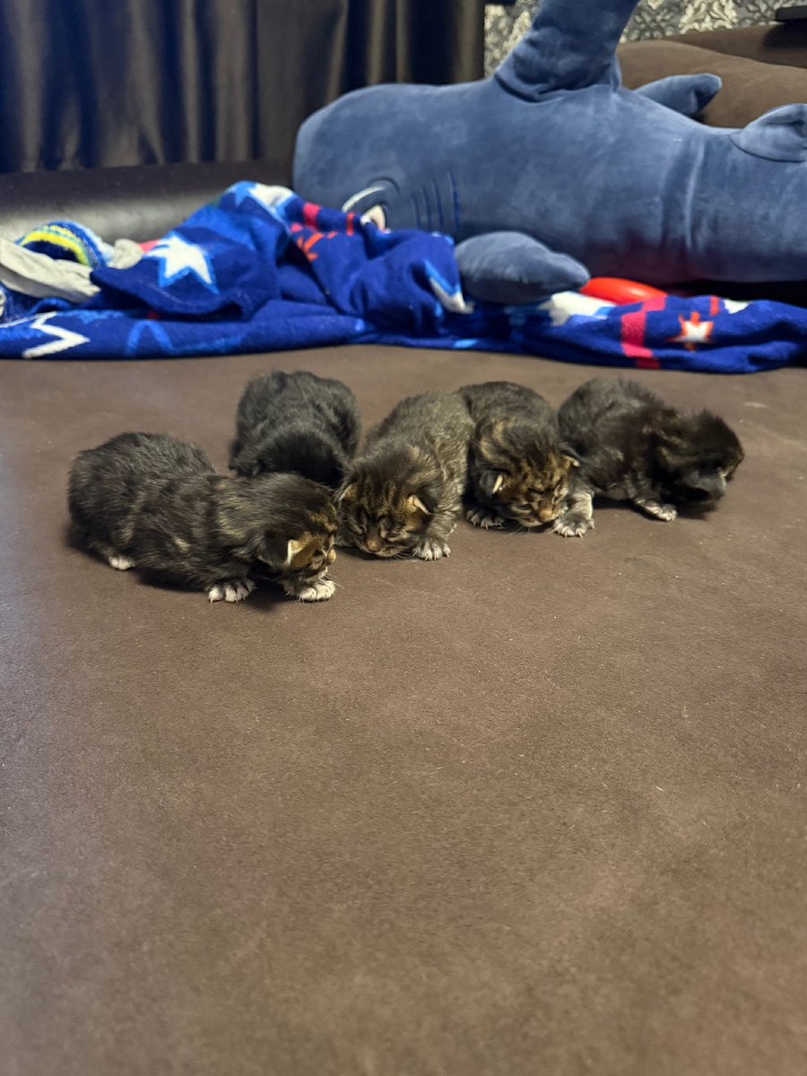 Наша Бонечка снова нам родила котят и на этот раз их пять штук 🫣 они все такие милашки!!! 4 темно-серые и 1 черный мальчик!