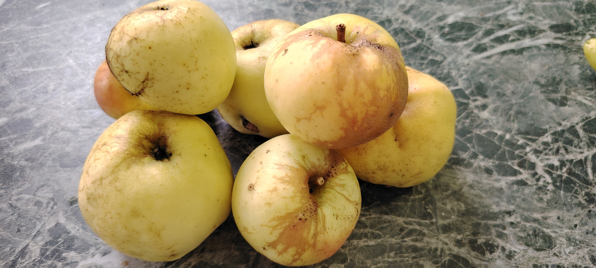 Яблок антоновки совсем немного в этом году, и они все страшненькие. Хотя в урожайные годы они вырастают крупными и красивыми.