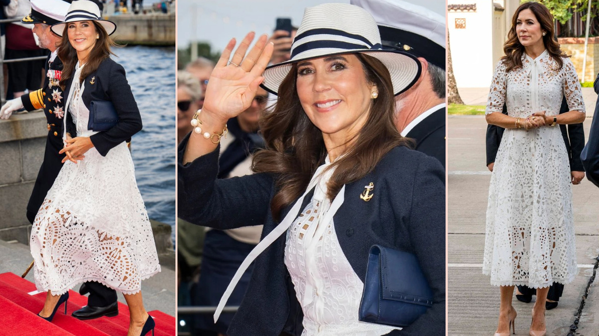 Королева Мэри и король Дании Фредерик сошли с борта королевской яхты Dannebrog, чтобы устроить прощальный ужин для экипажа после летнего круиза. Мэри доказала, что она - профессионал в том, что касается "чуть было не случившегося сбоя" в гардеробе, когда она вместе с мужем сошла с борта королевской яхты Dannebrog, чтобы устроить последний ужин для экипажа после летнего круиза. 53-летняя датская королева австралийского происхождения помахала поклонникам, когда ветер подхватил ее белое платье. Представляя современный образ Мэрилин Монро, королевская особа продолжала двигаться, но при этом успевала махать толпе, а улыбка не сходила с ее лица. Жена короля Фредерика предстала в элегантном наряде Berry от Temperley. Оно имело кружевной дизайн с вырезами, юбку А-линии, рукава длиной до локтя и завязку на шее. Полупрозрачный наряд стал более осенним, когда Мэри противопоставила белому летнему платью замшевые туфли темно-синего цвета (модель Romy 100' от Jimmy Choo) и шелковый жакет от Prad